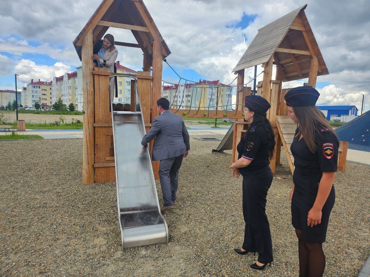 Были проверены площадки у домов №9 и №10 в седьмом микрорайоне, Центральная детская площадка, Сквер имени геологов, стадион «Олимп».