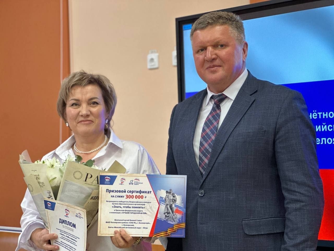 Конференция завершилась награждением лауреата Всероссийского конкурса музеев в Уральском федеральном округе - школьный музей Боевой славы Средней школы № 3 города Белоярского в лице её директора Ольги Меньщиковой.
